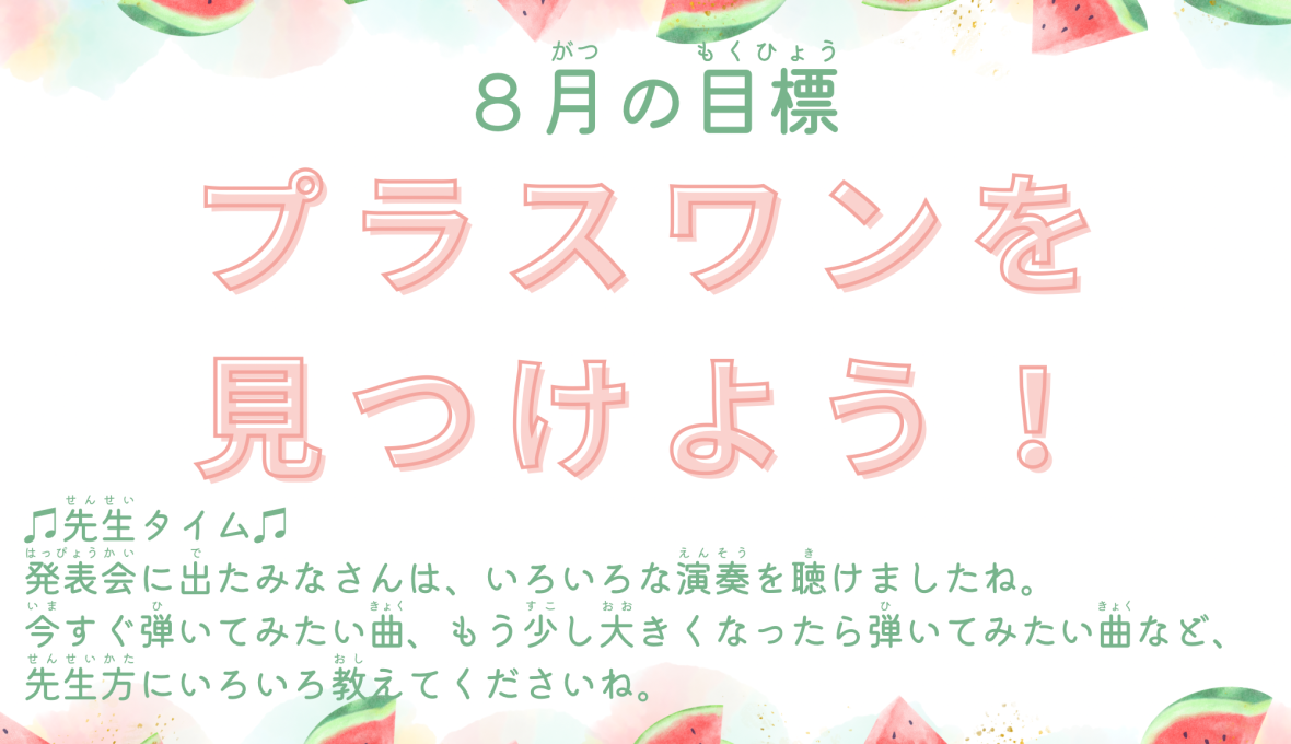 Contents1 8月の目標は「プラスワンを見つけよう!」✨2 プラスワンってなに?3 発表会の振り返りとつなげて4 まとめ 8月の目標は「プラスワンを見つけよう!」✨ おひさまmusic♪では、毎月レッスンに共通の目 … 続きを読む 2025年8月|今月の目標