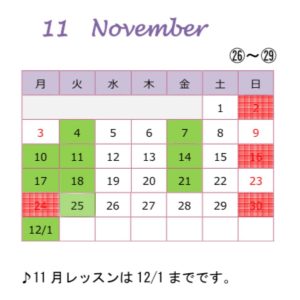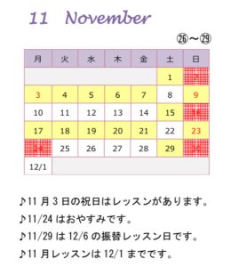 ♪12/6(土)は、市内の小学校が一斉授業のため、11/29(土)に繰り上げて、レッスン日といたしました。