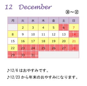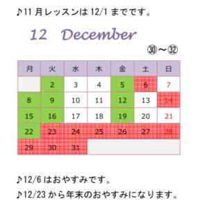 ♪12月は年末のため、どの曜日も3回レッスンになっています。
